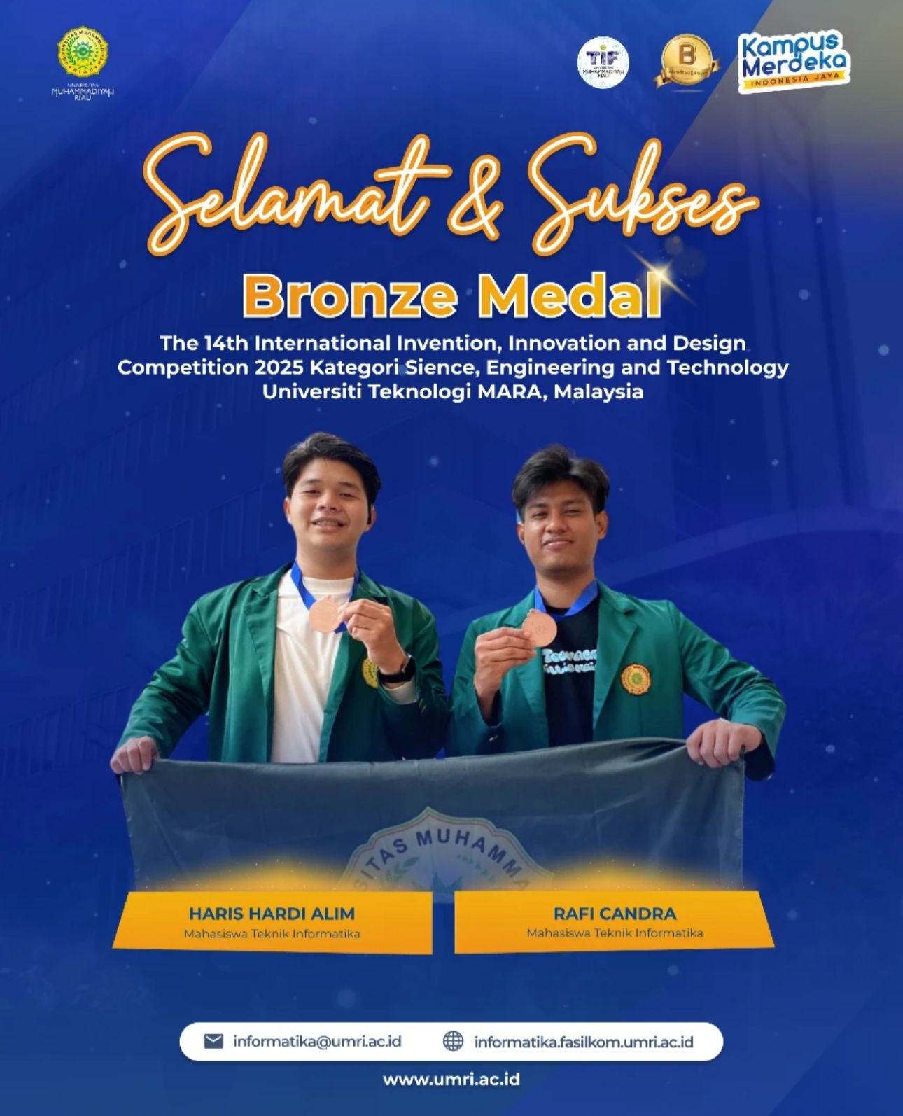 Program Studi Teknik Informatika Universitas Muhammadiyah Riau (UMRI) kembali mencetak prestasi membanggakan di kancah internasional. Dua mahasiswa hebat, Haris Hardi Alim dan Rafi Candra, berhasil meraih Bronze Medal ๐ฅ dalam kompetisi bergengsi dunia, The 14th International Invention, Innovation, and Design Competition (IIDC) 2025, yang diselenggarakan oleh Universiti Teknologi MARA (UiTM), Malaysia.